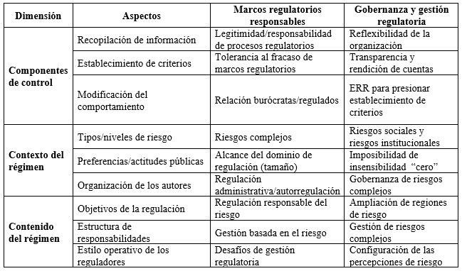 En los componentes de control del régimen (Hood ...[et al], 2006a: 40 y ss.) la legitimidad de los procesos regulatorios y la reflexividad de la organización se entienden como aspectos claves en la recopilación de información (Rothstein, 2002). En el plano del establecimiento de criterios (Hood ...[et al], 2006a), se advierte un tipo de aprendizaje organizacional basado en la tolerancia al fracaso de los marcos regulatorios (Black, 2008), a la transparencia y a la rendición de cuentas en actores del proceso regulador (Rothstein ...[et al], 2006). En su tercera dimensión, se aprecia que el componente de control del régimen vinculado con la modificación del comportamiento (Hood ...[et al], 2006a) -vínculo entre reguladores y regulados en los marcos regulatorios responsables (Black, 2008)-, converge con la presión que genera el ERR para establecer criterios de riesgo en instituciones gubernamentales (Rothstein ...[et al], 2006).