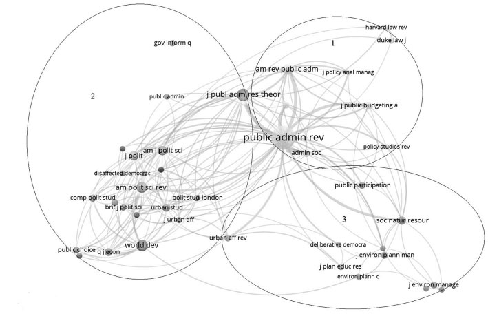 El mapa de cocitaciones presenta tres grupos (clústeres) diferentes. El primero y más importante lo ocupa el clúster N° 1 con la “Public Administration Review” como la revista más importante. Este clúster se encuentra conformado sobre todo por revistas relacionadas con el área de la administración pública. En segundo orden de importancia, se encuentra el clúster N° 2, cuya revista más importante es el “Journal of Public Administration Research and Theory”. No obstante, la gran mayoría de las revistas que conforman al clúster N° 2 corresponde al área de la ciencia política. Finalmente, en tercer lugar, se encuentra el clúster N° 3, el cual se encuentra conformado por revistas relacionadas con planificación medioambiental y recursos naturales, así como de revistas de participación y democracia. Se observa entonces la relevancia de la administración pública por sobre la ciencia política en los temas analizados, así como la importancia de la planificación medioambiental como tema recurrente en los estudios sobre participación y performance de gobiernos locales.