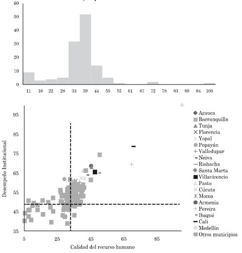 Analizando dimensión por dimensión, se puede apreciar en la Figura 7 que, en calidad del recurso humano, la mayoría de las entidades territoriales tiene puntajes entre 28 y 44 puntos, comparados con los 100 de Medellín. En este sentido, es claro que los municipios tienen mucho que mejorar en esta dimensión.