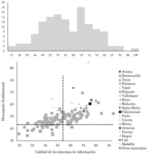 En la Figura 8 se puede apreciar la distribución de las entidades territoriales en lo relacionado con calidad de los sistemas de la información. Se puede analizar que existen dos rangos en los cuales se ubica la mayoría de los puntajes: entre 44 y 61 y entre 65 y 83. Si bien los del segundo grupo se encuentran mejor, es claro que existen muchas posibilidades de mejora para los Gobiernos locales en esta dimensión.