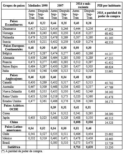 Cuadro 2. Coeficiente de Gini de los Ingresos antes y después de Impuestos y transferencias y PIB por habitante, en países seleccionados