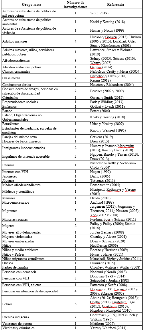 Sobre la distinción entre teoría y marco Las referencias analizadas permiten inferir que la mayor parte de los autores utilizan la propuesta de Ingram y Schneider como teoría (72%). Una parte minoritaria plantea su instrumentalización como “marco” (12%) y otra la expone como modelo (7%). En algunos casos aislados, los autores nominan la propuesta como “enfoque”, “esquema” y otros como “marco conceptual” o “marco teórico”. La estabilidad de estas cifras es relativa, puesto que la revisión evidencia que en algunas investigaciones se producen los siguientes conflictos interpretativos: · Se expresa que se está utilizando un marco, pero su despliegue evidencia la instrumentalización de la teoría de los grupos-meta (Dauda, 2010). · Se expresa que se está utilizando como marco, pero se omiten variables relevantes de aquel, especialmente las instituciones y la cultura institucional (Koski y Keating, 2018). · Se expresa que se está utilizando un marco, pero su despliegue evidencia la instrumentalización de la teoría de los grupos-meta y los efectos ultractivos de política (Sidney, 2005). · Se expresa que se está utilizando un enfoque, esquema, marco conceptual o marco teórico, pero su despliegue evidencia la instrumentalización de la teoría de los grupos-meta y los efectos ultractivos de política (Barbehön y Haus, 2008; Yates y Whitford, 2011; Urias y Yeakey, 2009; y Mettler, 2002). Sobre los grupos-meta En general las investigaciones utilizan los tipos ideales de los grupos-meta de tres maneras: la primera, examinando la distribución de beneficios y restricciones en un solo conjunto poblacional (v. gr. Mujeres); la segunda, indagando un solo grupo-meta, pero generando cruces con otros atributos para encontrar asimetrías en la distribución de beneficios y restricciones (v. gr. Mujeres heterosexuales con VIH vs. Internos con VIH); y la tercera, distribuye los actores de un subsistema de política en cada una de las cuatro posiciones que se obtienen al cruzar las variables de construcción social y capacidad política (v. gr. Actores del subsistema de vivienda).