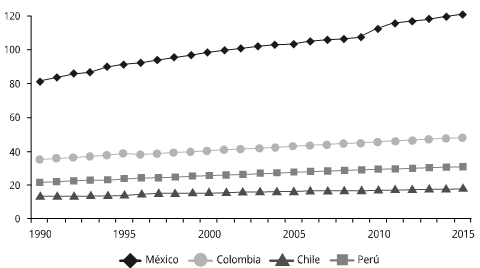 El indicador demográfico presentado en el Gráfico 1 muestra la progresión de cada país en el lapso estudiado. En orden decreciente, México cuenta con más de 120 millones de habitantes; Colombia cuenta con aproximadamente 47 millones de habitantes; Perú con más de 30 y Chile supera los 18 millones de habitantes. La mayor diferencia poblacional es entre México y Chile que supera los 100 millones de personas.
