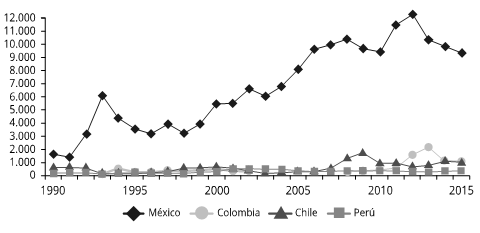 En el Gráfico 9 se aprecia cómo han sido los procesos de otorgamiento de patentes por año en cada uno de los países seleccionados. México nuevamente destaca en el número total distanciándose de los otros tres países de forma significativa. Este país otorgó menos de 2 mil patentes en los primeros dos años y entre 9 y 12 mil en los últimos 10 años (2006-2015). Colombia, Chile y, en menor grado, Perú se mantienen en una franja inferior a las 2 mil patentes en casi todos los años.
